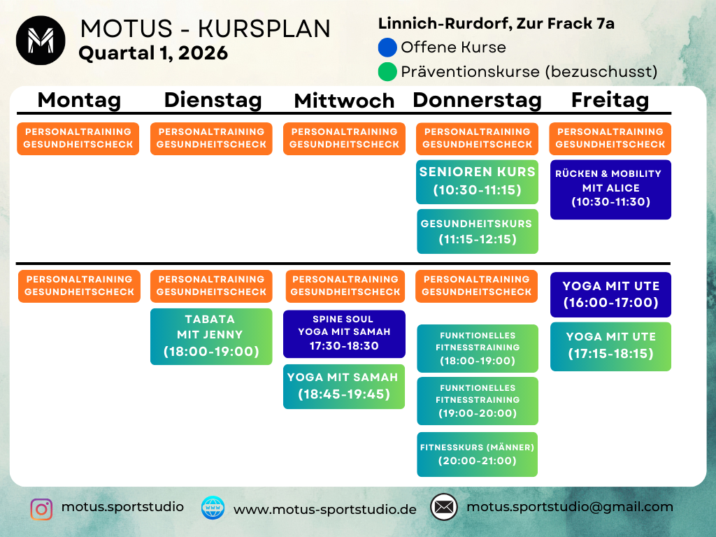Hier öffnet sich die Tür zu einem ganzheitlichen Fitnesserlebnis! Dieser Kurs legt den Fokus nicht nur auf isolierte Muskelgruppen, sondern auch auf die Optimierung natürlicher Bewegungsmuster und die Stärkung des gesamten Körpers. Ganz gleich, ob du deine Kraft steigern, deine Beweglichkeit verbessern oder einfach fit bleiben möchtest – unser Programm bietet abwechslungsreiche Übungen, die deinen gesamten Körper herausfordern und formen. Bereite dich darauf vor, deine Fitnessziele auf eine effektive und nachhaltige Weise zu erreichen!
